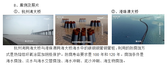 4、壽命長:港珠澳大橋及杭州灣大橋海水中的鋼管樁使用該防腐技術(shù),防腐年限分別是100年和120年。耐海水腐蝕,海水及泥砂沖刷,耐海水與淡水交替腐蝕,耐海洋生物腐蝕,耐打入泥沙時的樁擊。